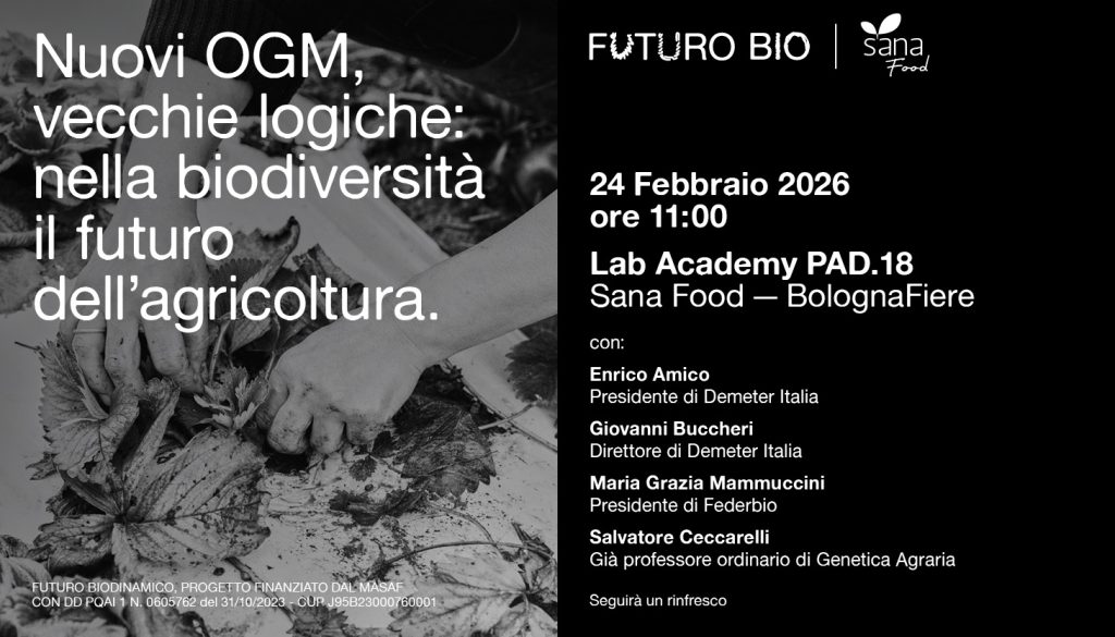 L’incontro, intitolato “Nuovi OGM, vecchie logiche: nella biodiversità il futuro dell’agricoltura” e promosso dal progetto “Futuro Bio” si terrà martedì 24 febbraio 2026 alle ore 11.00 presso la Lab Academy (Padiglione 18) di BolognaFiere. Saranno presenti esponenti di spicco del mondo del biologico, della biodinamica e della ricerca scientifica, tra cui Enrico Amico, presidente di Demeter Italia, Giovanni Buccheri, direttore di Demeter Italia, Maria Grazia Mammuccini, presidente di FederBio, e il genetista Salvatore Ceccarelli.